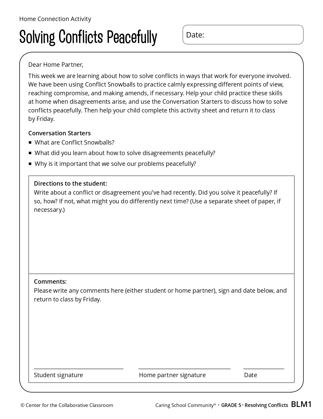 This is an example of a Home-Connection Activity in the 5th grade. It highlights the SEL skill of peacefully resolving conflicts.